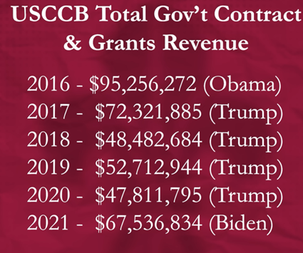 We need to ensure that there is accountability for the billions of dollars going to all agencies, particularly USCCB and Catholic Charities, which are helping to facilitate human trafficking. It’s important to note that USCCB receives a one-third to one-half of their annual total funding from migration services from the government. The table below gives you a sense of the funding patterns by year to the USCCB by the government, much of which is derived for migration services: