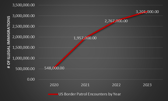 The number of illegal immigrants crossing the border (2021-2023) stands at 7.9 million, which is equivalent to more than 5% of people who voted in the 2020 presidential elections and 2.3% of the entire US population. It’s important to note the seriousness of this rapid influx, which poses a significant challenge to assimilation efforts. Additionally, there are many illegal immigrants crossing the border who pose a serious threat to our country, including drug traffickers, human traffickers, and terrorists.