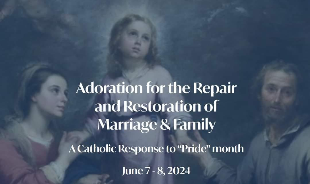 It is high time we go directly to the Lord in Adoration to restore marriage and the family. Parishes are holding adoration to pray for the repair and restoration of marriage and the family.  A list of participating parishes and their adoration times for prayer on June 7-8, 2024 is being accumulated here.  If you do not see your parish on the list, ask your pastor to participate and then notify CatholicCaravan.org.